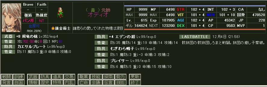 今現在のステータス HPはつい先日カンスト HP4500あたりで2000万投入したがカンストせず さらにそこから400万ほどつっこんでようやくカンスト ギルアップのスリとるで延々狩ってたら LVもいつの間にか600を超えていたという 能力は平均的すぎて強くはない 魔法剣士になれるのはいつになるやら… 装備は自慢できそうなのはエデン鎧ぐらい ただしレア度という意味で 狩り武器は以前は+6Hヴィジランティ(攻:818)だったのだが、 貫通・必中・速↑につられて+8N飛竜の槍にしたがこれが大失敗 /(^o^)\ 両手補正が付かない分、ダメが出ない出ない… 貫通してどうにかってほど メインにRUしたらもう少し違ったんだろうけどなぁ 与一の矢をストックしてあるので狩り武器にできる良弓を待ってるところ <<前のページ | | 最新記事