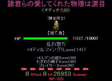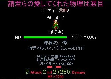 共通の条件は武器はティルフィング最終 攻:1614(Max)を使用、 装備はブレイサーで攻撃力を20%アップ、エデン鎧のブレイブで更にダメージ20%アップ、 Sアビは剣装備可能をセットし最終ダメージ25%アップ、 相手は作戦によるダメージの揺れがほとんどない骸旅団の白魔たんとし、 パリィ、連撃、クリティカルが出ていない時の捨て身攻撃、以上とする。 まずは渾身の一撃 ダメージは27000強 続いて乱れ撃ち ダメージは約27000 ダメージ量はどちらもほとんど変わらないが渾身の一撃は ・MP消費が武器消費に2500も上乗せされる ・迎撃発動するせいで付け替えるタイミングを計る必要がある ・付け替えるJPが200もかかる と、致命的なポイントがあるせいで攻撃力+4000も数字の響きだけの死にアビだった…。 両手剣でなければ発動できないという特徴も武器を強制されるという点で水を差す。 乱れ撃ちは過剰強化による消費MP軽減が反映されないが 渾身の一撃の名前負け具合からいえば大した問題ではなかったりする。 現時点での結論:物理スキーは基本的に乱れ撃っとけ 相手が白魔たんだったのでダメージ差が出なかったと思えば少しは期待が持てそうだが クリ相手に試す機会があるかは疑問。探索で試せたら試すつもり。 それでも大した差がでなかったら… 泣くしかねぇや (´Д⊂ヽ 消費MPが減るのは勿論のこと、STRがすごい上がって代わりにAGIとDEXが下がるとか 「渾身」っぽい感じに修正されたらいつかは日の目を見るのだろうか…。 攻撃力は落とされるだろうからどっちにしろ泣くしかなかったりして /(^o^)\ 随分と長くなってしまったが今回の検証は以上。次回は何やろうかな。 PR